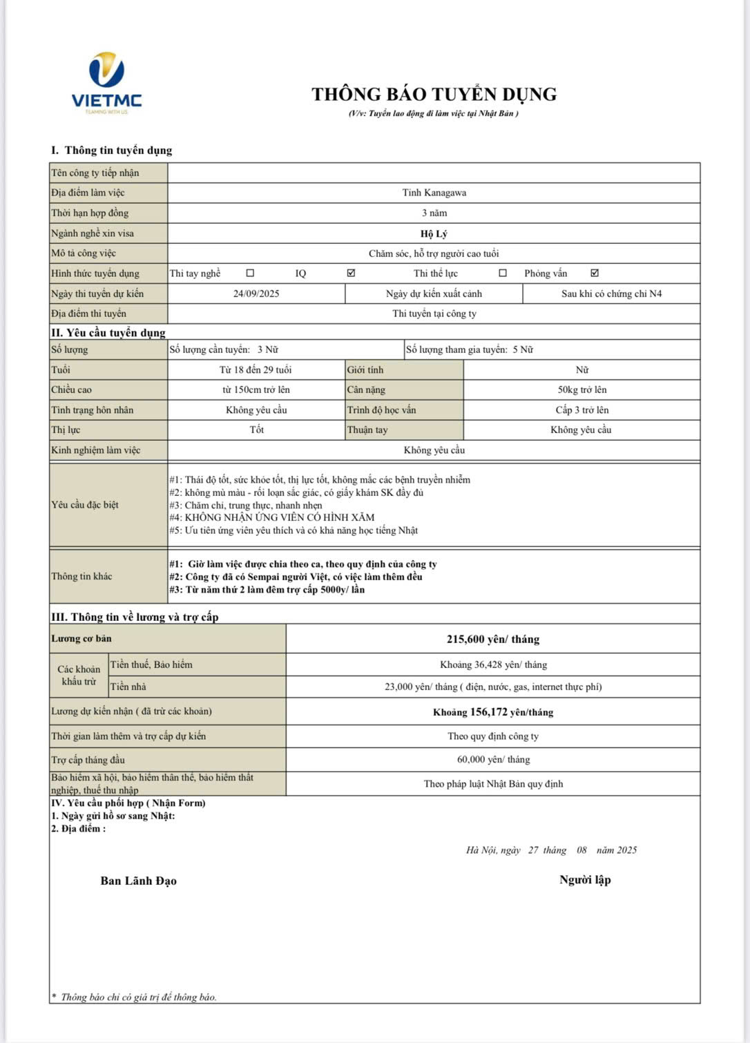 Đơn hàng Hộ lý tuyển 2 bạn nữ thi tuyển ngày 25.09.2025