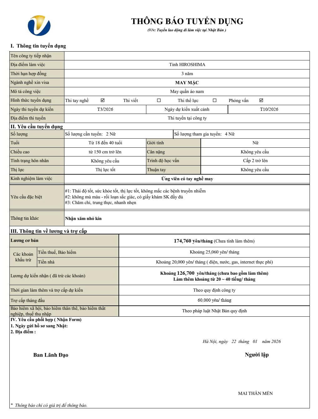 5 / 03 2026 ĐƠN HÀNG MAY 2 NỮ – TỈNH HIROSHIMA Đơn hàng May 2 nữ – Tỉnh Hiroshima Lương cơ bản 174.000 yên/ tháng Phỏng vấn tháng 03/2026 Công ty có nhiều người việt, thực lĩnh hàng tháng trên 170.000 yên